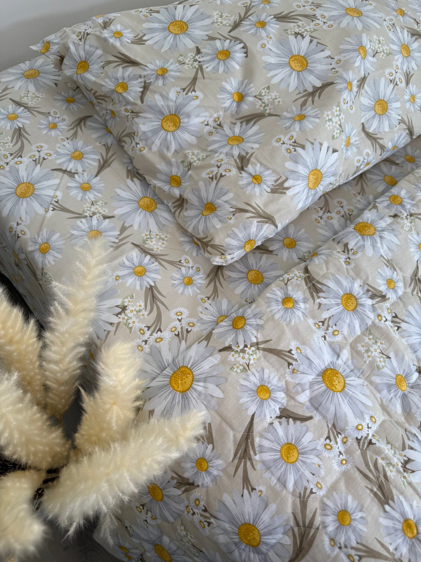 Une couette légère, un drap et un oreiller avec taie, le tout qui se répond en un seul oreiller pratique et gagne de place.